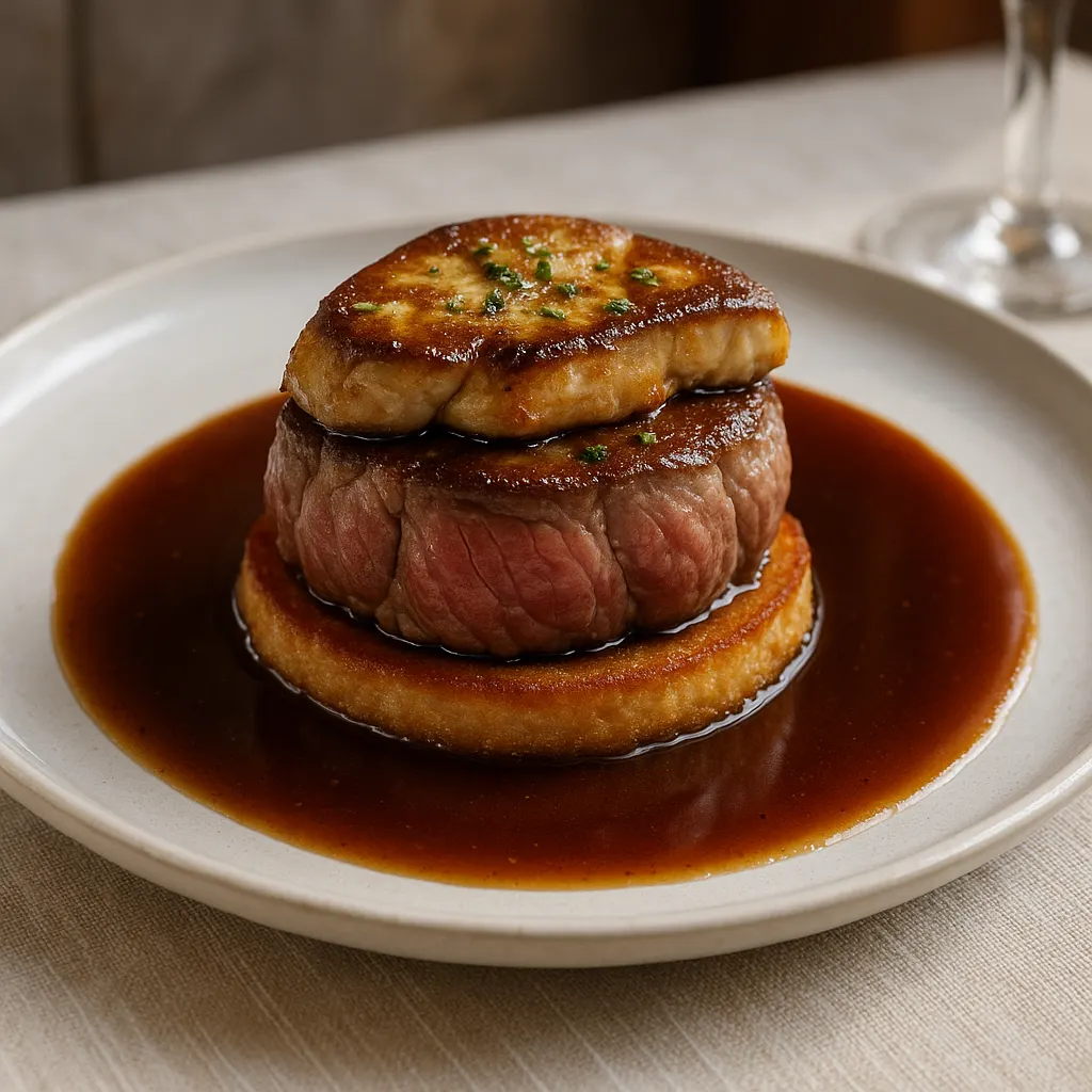 Des tournedos rosés sur croûton, coiffés de foie gras poêlé et servis avec une sauce courte au madère.…