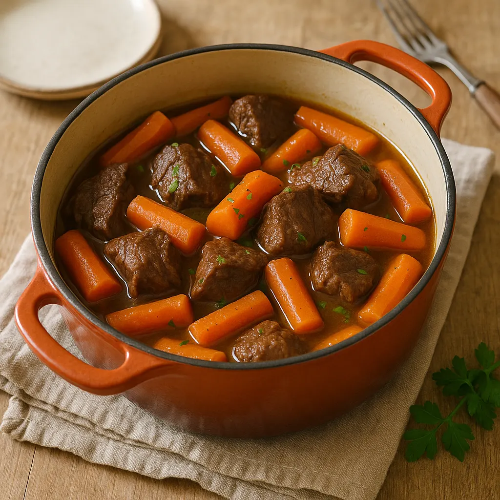 Le bœuf aux carottes est un plat de cocotte franc et sans difficulté particulière. Il demande surtout un peu de soin au départ, puis une cuisson régulière. On n’est ni sur un pot-au-feu, ni sur un bourguignon : le jus reste brun, léger, peu marqué par le vin, et les carottes doivent cuire sans se défaire.