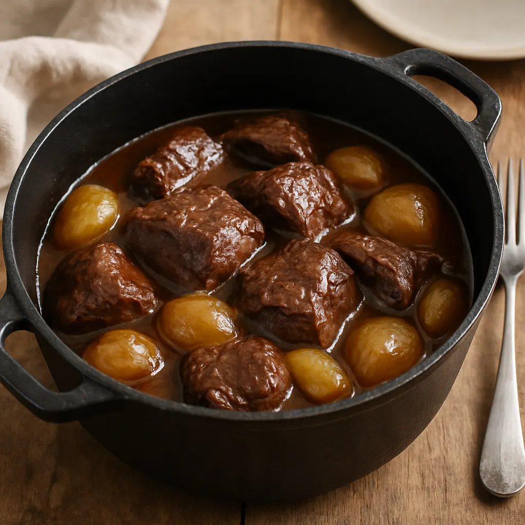 Ce n’est ni un bourguignon, ni une estouffade. Ici, les oignons prennent une place centrale. Ils cuisent longtemps, fondent dans le jus et donnent du relief au plat sans le rendre lourd. C’est ce qui fait son caractère.