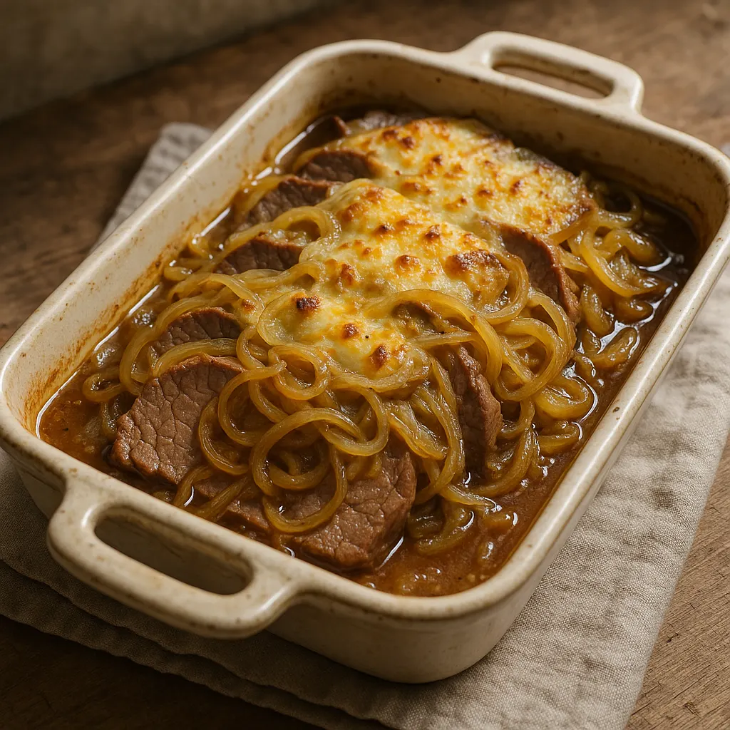 Le plat se termine souvent dans un plat à gratin. Disposez les tranches en une couche légèrement chevauchée, couvrez d’oignons et de sauce, puis ajoutez un peu de chapelure. Quelques petites noisettes de beurre sur le dessus aident à blondir la surface, mais ce n’est pas une obligation si le plat est déjà assez riche.