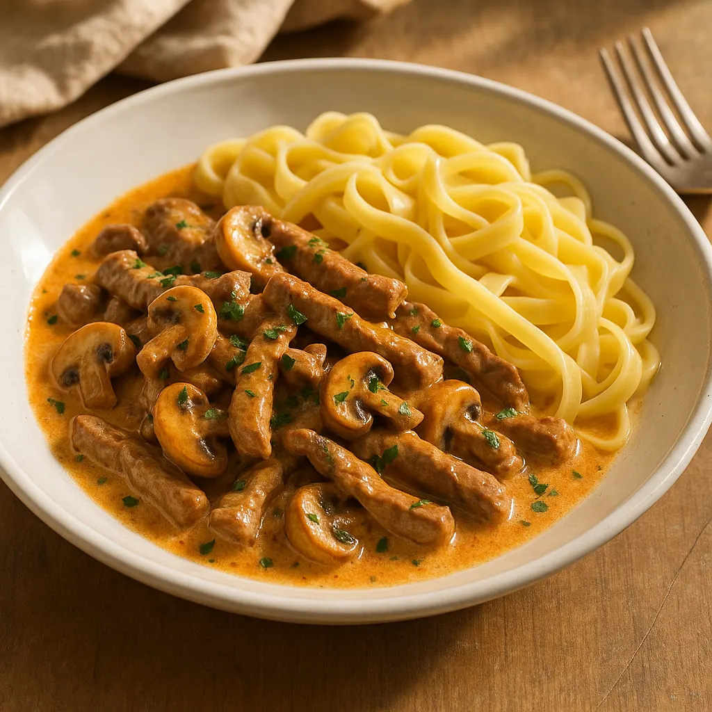Le bœuf stroganoff se joue en quelques minutes de cuisson. C’est ce qui fait son intérêt, mais aussi sa difficulté : la viande doit rester tendre, les champignons doivent vraiment dorer, et la sauce doit napper sans devenir lourde. On n’est pas sur un plat mijoté. Si on laisse trop cuire, le bœuf durcit vite et la sauce perd en finesse.