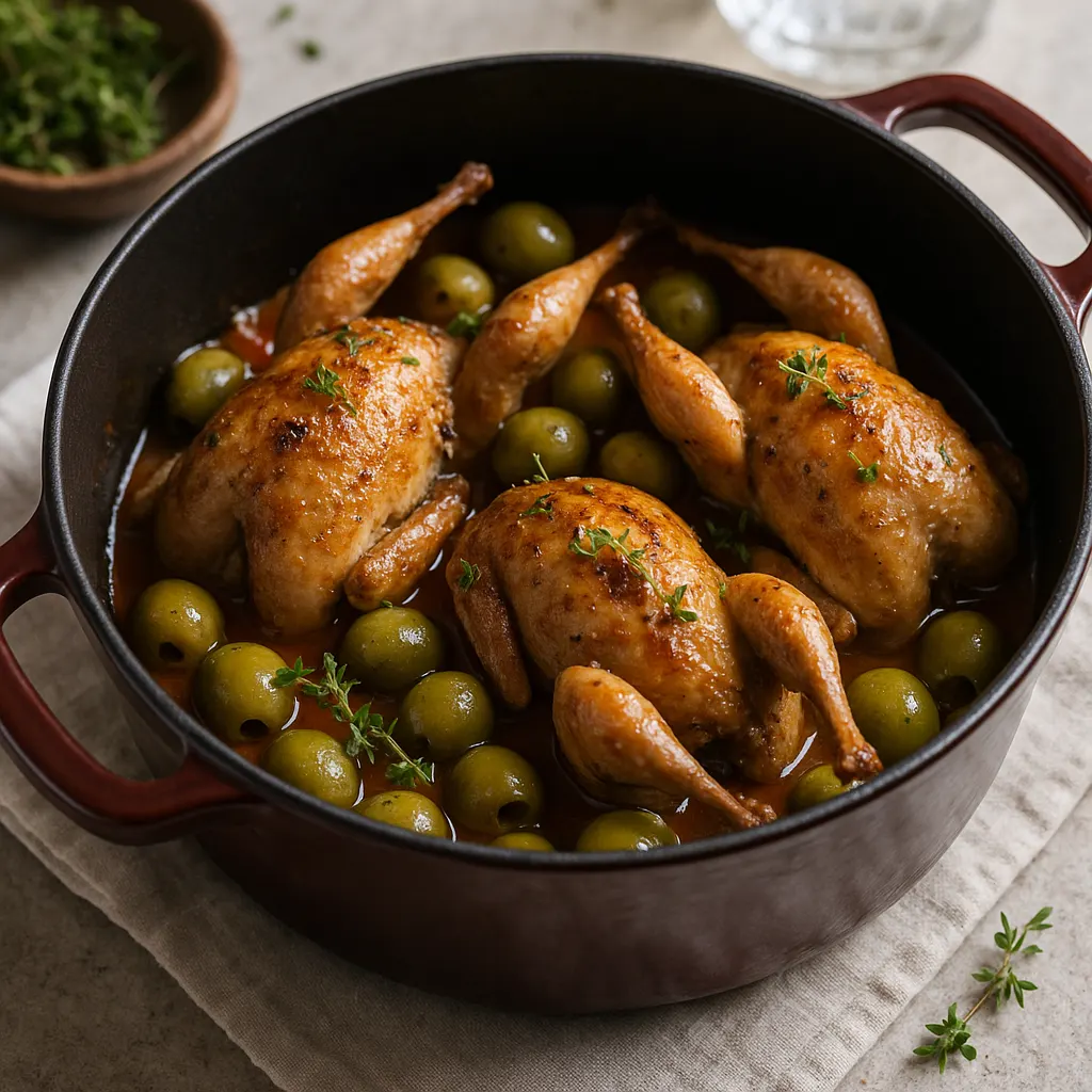 La caille supporte très bien la cuisson en cocotte, à condition de ne pas la brusquer. On la fait d’abord bien dorer, puis on termine doucement avec un peu de tomate, du vin blanc, de l’ail et des olives. Le jus reste court, assez concentré, et la chair garde sa souplesse.