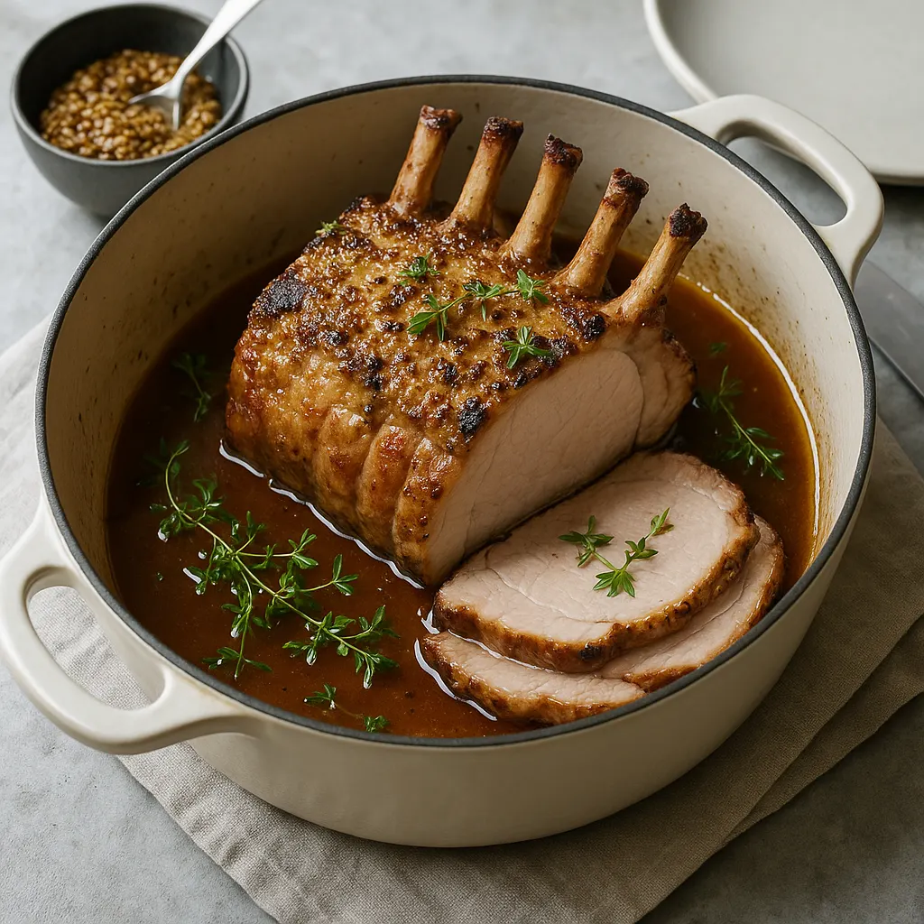 Le carré de porc est une belle pièce, mais sa cuisson demande surtout un peu d’attention. En cocotte, c’est assez simple à maîtriser : on colore d’abord la viande pour donner du goût, puis on termine à couvert avec peu de liquide. La moutarde à l’ancienne, l’ail et le thym parfument le jus sans masquer le porc.