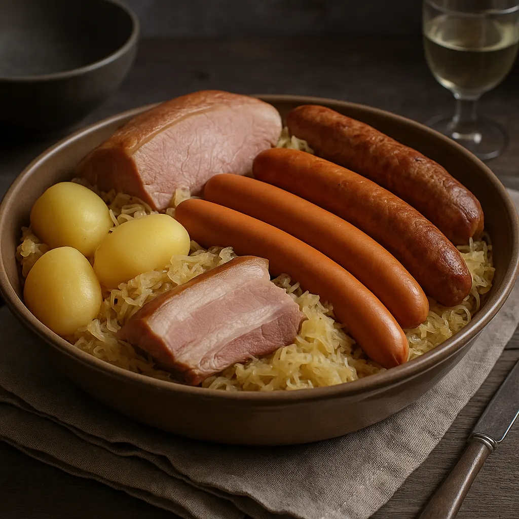 Vous pouvez adapter la garniture selon ce que vous avez : un jarret demi-sel à la place d’une partie de la palette, ou des knack d’Alsace à la place des Strasbourg. Mieux vaut simplement éviter d’accumuler trop de viandes. Le chou doit rester au centre du plat.