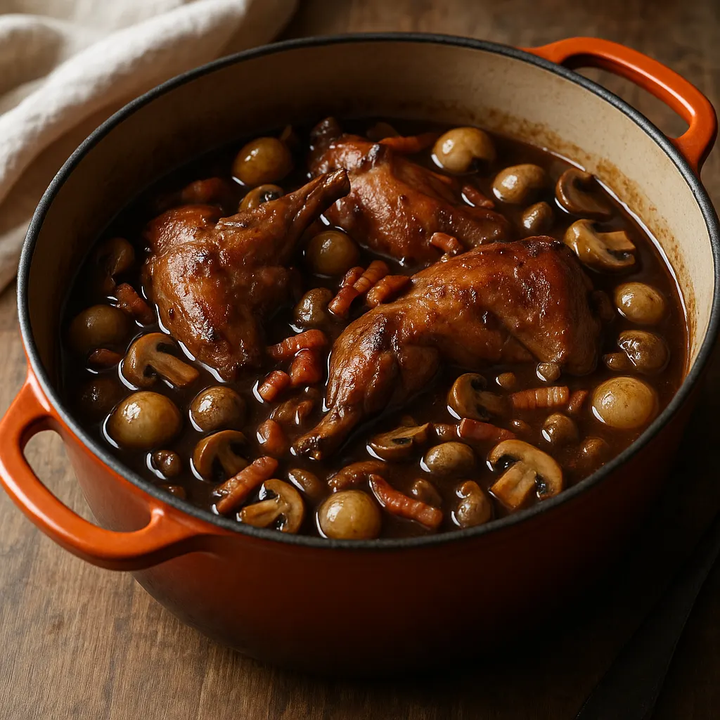 La base reste très classique : vin rouge, lardons, oignons, champignons, bouquet garni et un peu de farine pour lier. Le lapin a une chair plus fine qu’un bœuf à braiser. Il faut donc surveiller la cuisson pour garder des morceaux tendres qui se tiennent encore bien. Si vous aimez ce type de plat, vous pouvez aussi regarder le coq au vin traditionnel ou la fricassée de lapin aux lardons et champignons.