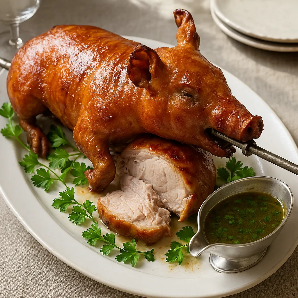 Le cochon de lait à la broche demande surtout une cuisson régulière. Il ne s’agit pas de rôtir vite, mais de laisser la chaleur faire son travail peu à peu. La graisse fond, la chair reste souple, et la peau sèche avant de devenir croustillante. C’est cet équilibre qui fait la réussite du plat.