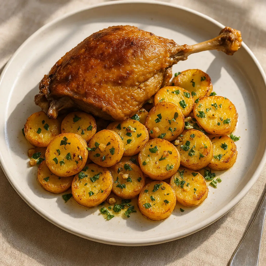 Le plat repose sur peu d’ingrédients. Chaque détail compte donc davantage : bien sécher les pommes de terre, ne pas surchauffer les cuisses, saler avec retenue, et retirer l’excès de graisse si la poêle est trop chargée.
