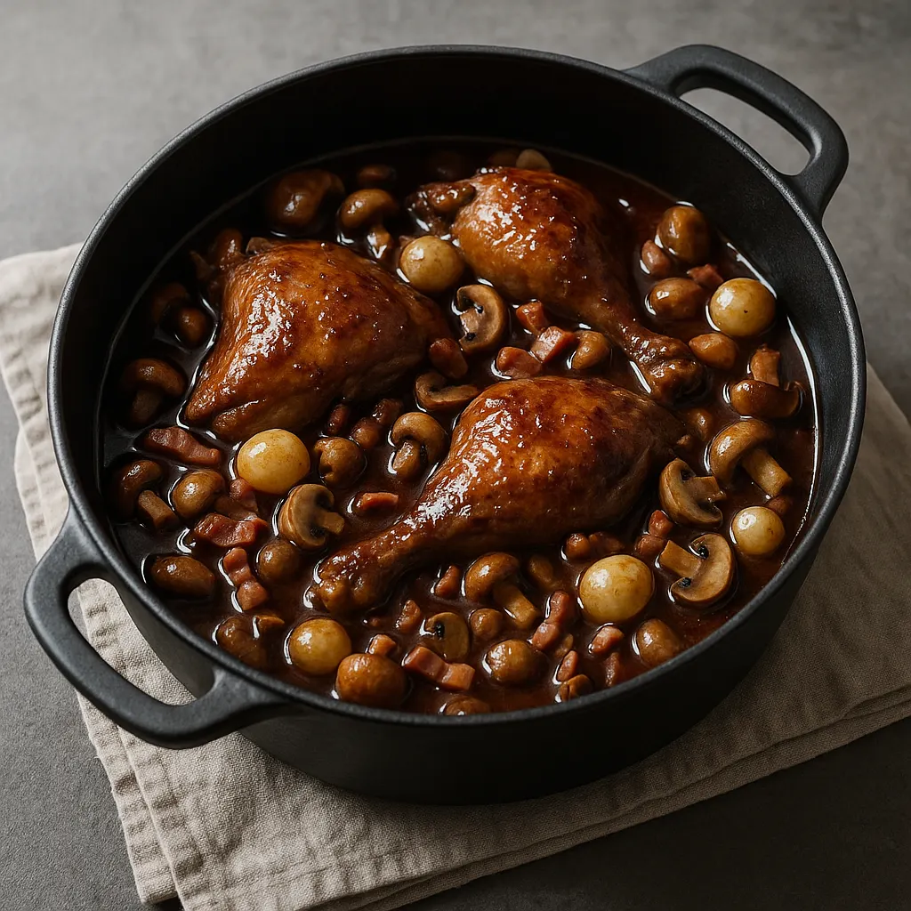 Le point à surveiller, c’est le feu. Si le liquide bout trop fort, la viande durcit et la sauce réduit mal. À petits frémissements, le poulet garde sa tenue, le vin a le temps de cuire et l’ensemble prend du goût sans se troubler.