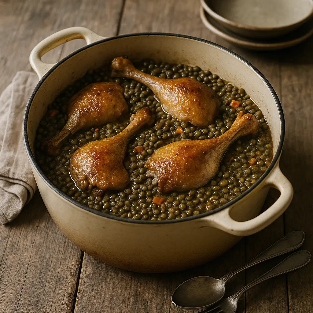 Les cuisses de canard et les lentilles forment une cocotte franche, avec peu d’ingrédients mais peu de place pour l’à-peu-près. Il faut du temps, une cuisson douce et un peu d’attention sur les textures. Le canard doit cuire lentement pour rester moelleux, et les lentilles doivent finir tendres sans se défaire.