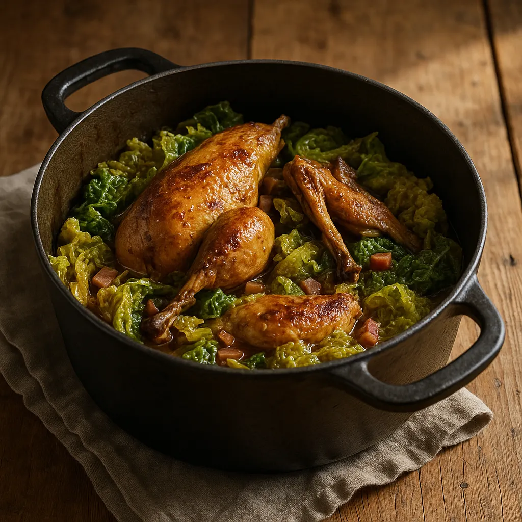 Pour le chou, prenez un chou vert bien serré, lourd, avec des feuilles fraîches. Coupez-le en larges lanières plutôt qu’en fine chiffonnade : il se tient mieux à la cuisson et garde de la mâche. Le blanchir avant de l’ajouter dans la cocotte change vraiment le plat : il devient plus souple, rend moins d’eau et son goût reste plus propre.