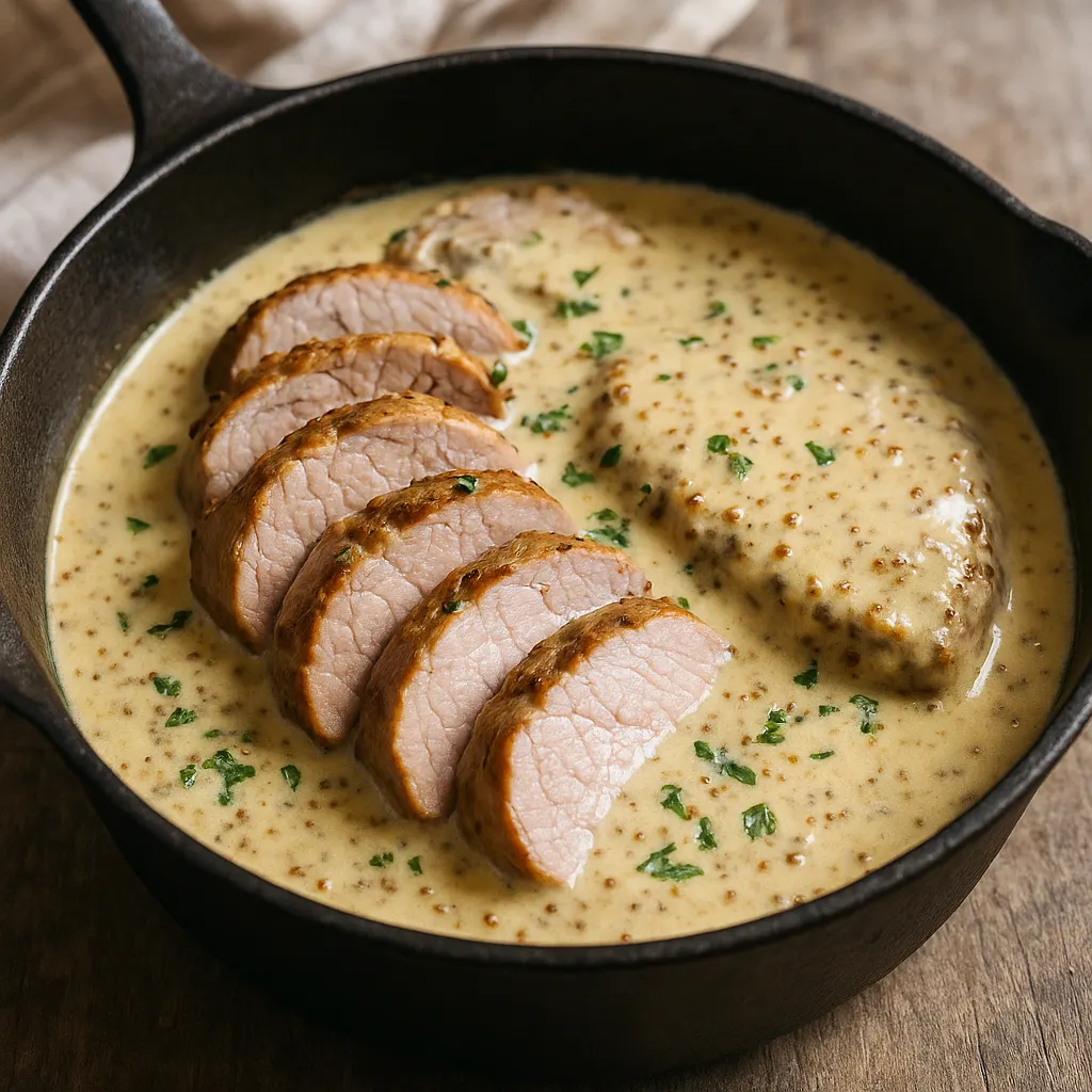 Le filet mignon de porc convient très bien à ce type de cuisson. Il cuit assez vite, reste tendre si on ne le pousse pas trop, et la sauce se prépare dans la même cocotte. La moutarde à l’ancienne apporte du relief, le vin blanc équilibre la crème, et l’ensemble garde un goût net.