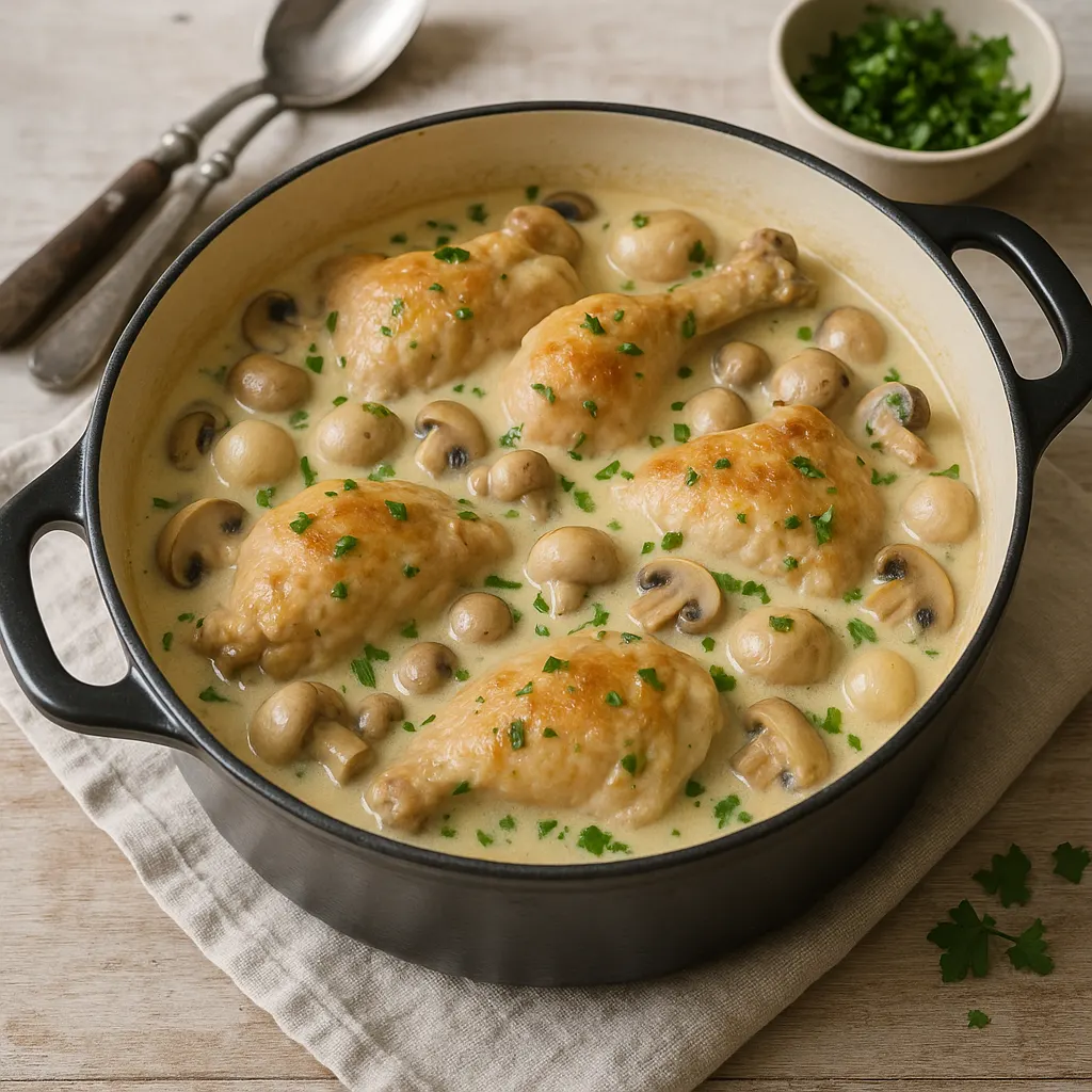 La fricassée de poulet à l’ancienne est un plat de cocotte assez direct dans son principe : on fait revenir le poulet sans le faire brunir, on mouille avec un peu de bouillon, puis on termine avec une liaison à la crème et au jaune d’œuf. La sauce reste claire, souple, et enrobe bien les morceaux. L’esprit est proche d’une blanquette, avec une cuisson plus courte et le goût plus franc du poulet.