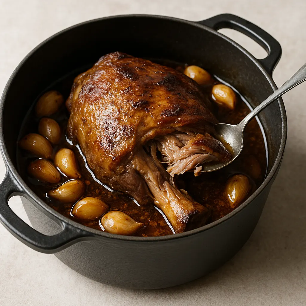 La cocotte doit rester couverte pendant presque toute la cuisson. C’est ce qui garde l’humidité et permet à la viande de cuire doucement sans dessécher. Retourner le gigot une ou deux fois pendant les 6 h 30 est utile, mais inutile d’ouvrir sans arrêt. Regardez simplement s’il reste un peu de liquide au fond.