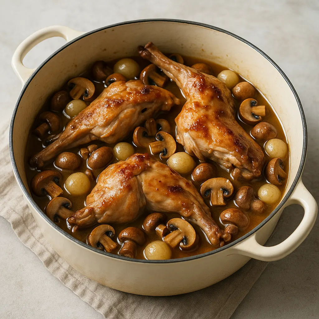 Le lapin demande surtout une cuisson douce et régulière. Pour garder une viande moelleuse, il faut d’abord bien colorer les morceaux, puis laisser mijoter sans ébullition forte. Ici, les champignons sont cuits à part pour garder du goût et éviter qu’ils ne détrempent la sauce.