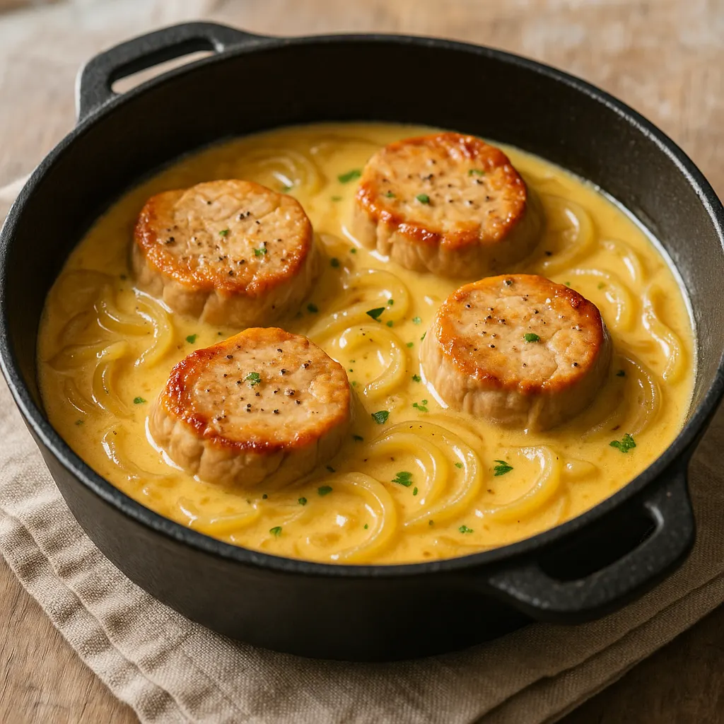 Le filet mignon de porc se prête bien à ce type de cuisson en cocotte. On le saisit d’abord pour le colorer, puis on le laisse finir doucement avec des oignons fondus, de la bière blonde et du maroilles. La sauce reste courte, crémeuse, avec un goût franc, mais la viande garde sa place.