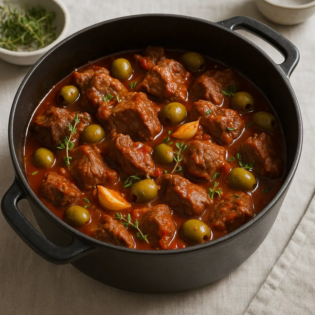 Pour les olives, les vertes dénoyautées sont les plus simples à utiliser. Elles tiennent bien à la cuisson et relèvent la sauce sans la dominer. Des olives violettes fermes peuvent aussi convenir. Dans tous les cas, goûtez-les avant de saler, car certaines sont déjà bien marquées.