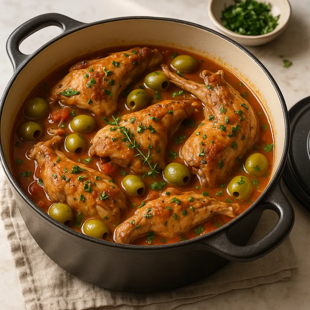 Le lapin aime les cuissons douces. En cocotte, il reste moelleux à condition de ne pas le laisser bouillir trop fort ni trop longtemps. Dans cette version à la provençale, la tomate reste en retrait, le vin blanc apporte un peu de nerf, et les olives vertes arrivent à la fin pour garder leur goût. On cherche une sauce souple, pas une base tomate épaisse.