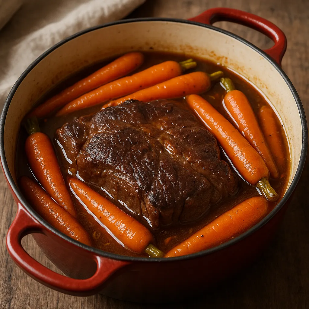 Ici, on est sur une préparation plus sobre qu’un bœuf bourguignon. Pas de sauce chargée, pas de garniture compliquée. Le goût du bœuf reste au premier plan, soutenu par les carottes, l’oignon et le bouquet garni. Si vous cherchez un plat de cocotte dans le même registre, le pot-au-feu de bœuf traditionnel va dans une autre direction, plus bouillon que réduction.