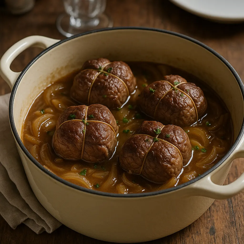 Les paupiettes de bœuf font partie de ces plats de cocotte qu’on peut préparer sans difficulté, à condition de soigner le départ. Une bonne coloration, un mouillement mesuré et une cuisson douce suffisent à donner une viande moelleuse et une sauce courte, pleine de goût. C’est un plat qui va droit au but, avec peu d’ingrédients mais des repères utiles.