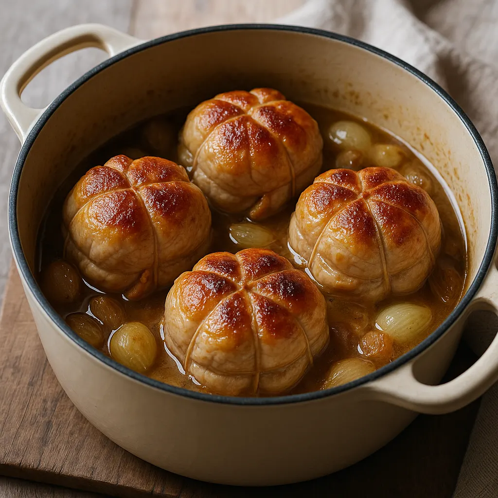Les paupiettes de dinde se prêtent bien à une cuisson en cocotte. On les fait d’abord bien dorer, puis on les laisse cuire doucement avec des oignons, un peu de vin blanc et du bouillon. La sauce reste courte, les oignons fondent, et la viande garde du moelleux si le feu reste modéré.