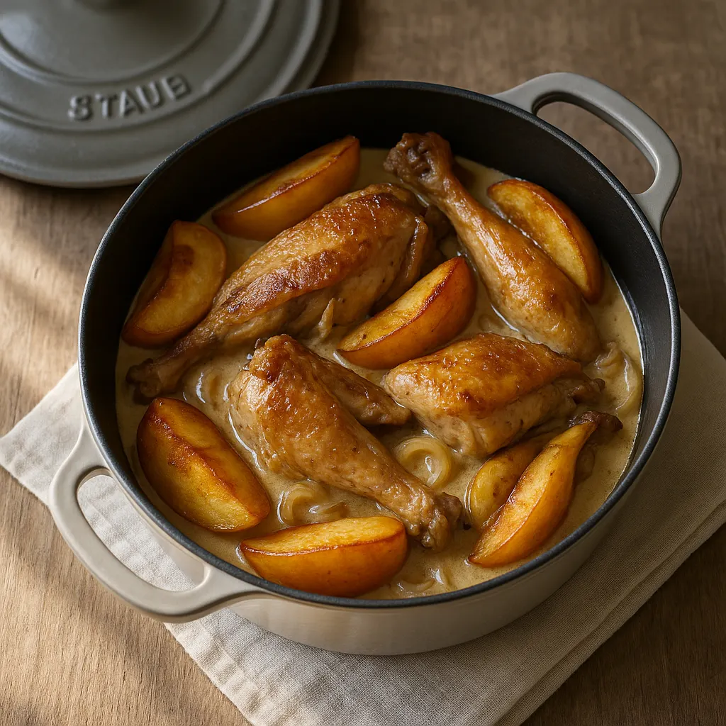 La pintade supporte bien la cuisson en cocotte, à condition de rester sur un feu doux. Sa chair a plus de caractère que celle du poulet, mais elle sèche plus vite si la cuisson est trop vive ou trop longue. Avec le cidre, on garde une base souple et légère, sans lourdeur. Les oignons cuisent dans le jus, les pommes sont dorées à part, puis ajoutées au dernier moment pour ne pas troubler la sauce.