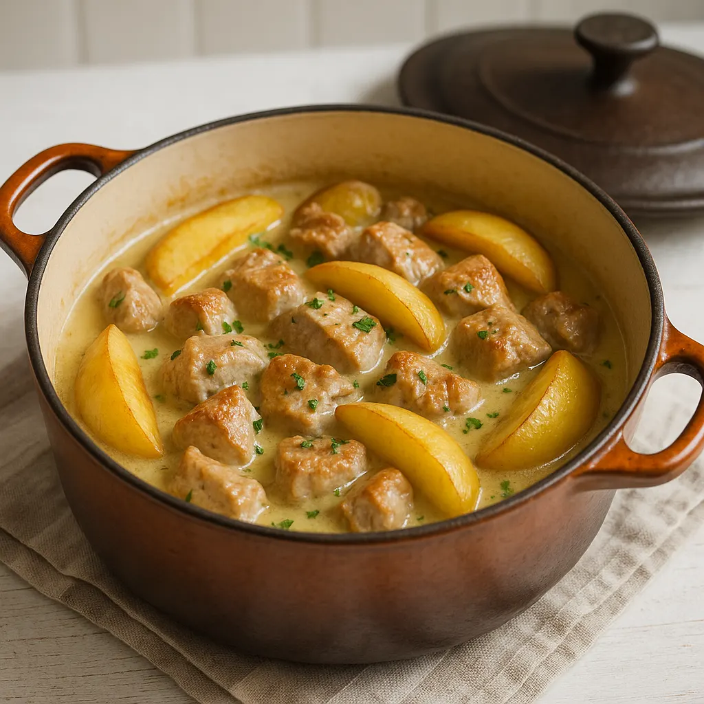 Le porc au cidre est un plat de cocotte assez direct, à condition de respecter quelques repères simples. La viande doit d’abord bien colorer, les oignons doivent cuire sans brûler, et le cidre doit frémir doucement. Les pommes, elles, gagnent à être préparées à part pour rester nettes et ne pas détendre la sauce.