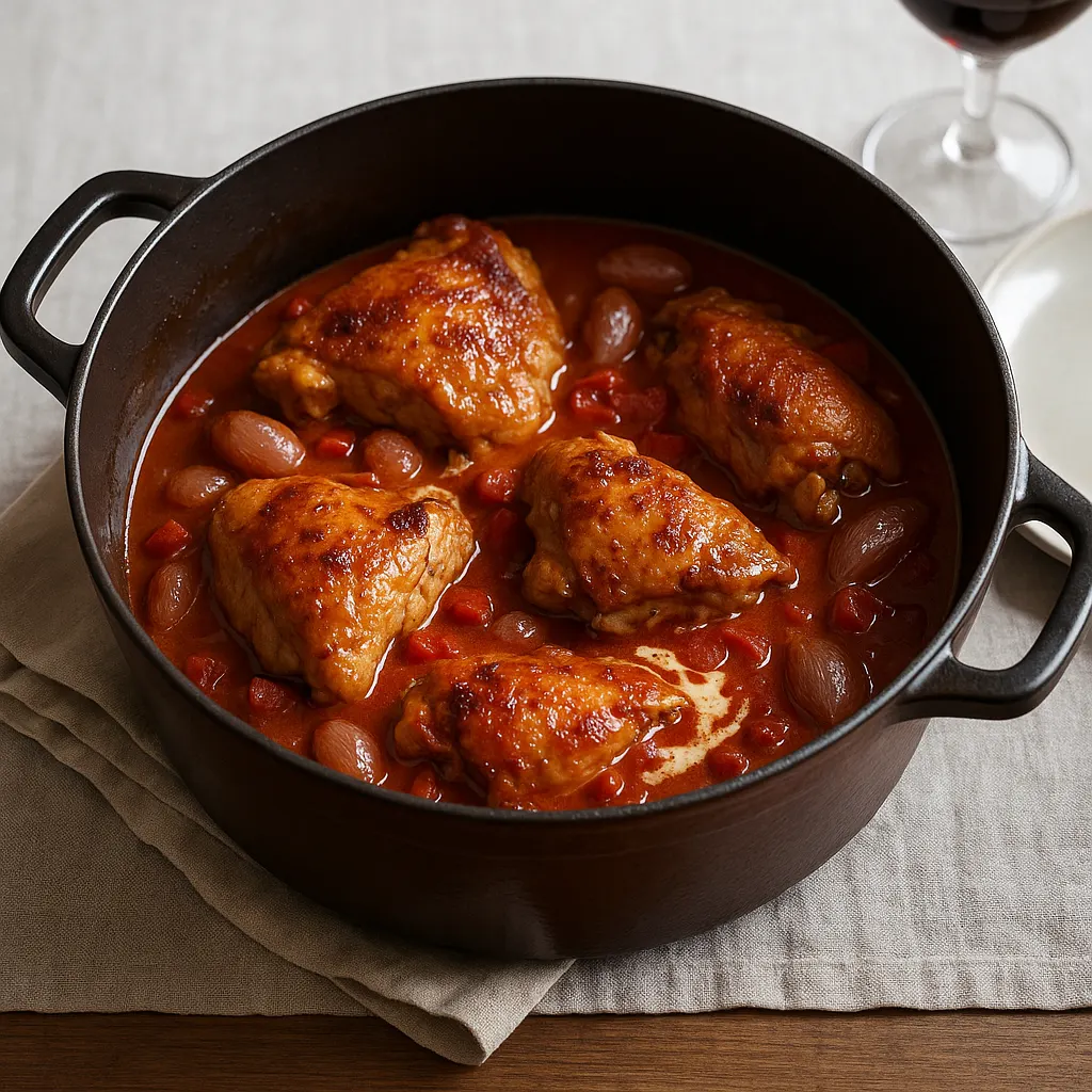 Si vous aimez les plats de cocotte du même registre, vous pouvez aussi regarder du côté du coq au vin traditionnel. Pour une version plus tournée vers les légumes, le poulet basquaise va dans une autre direction. Et pour une sauce plus douce, il y a aussi le poulet aux morilles à la crème.