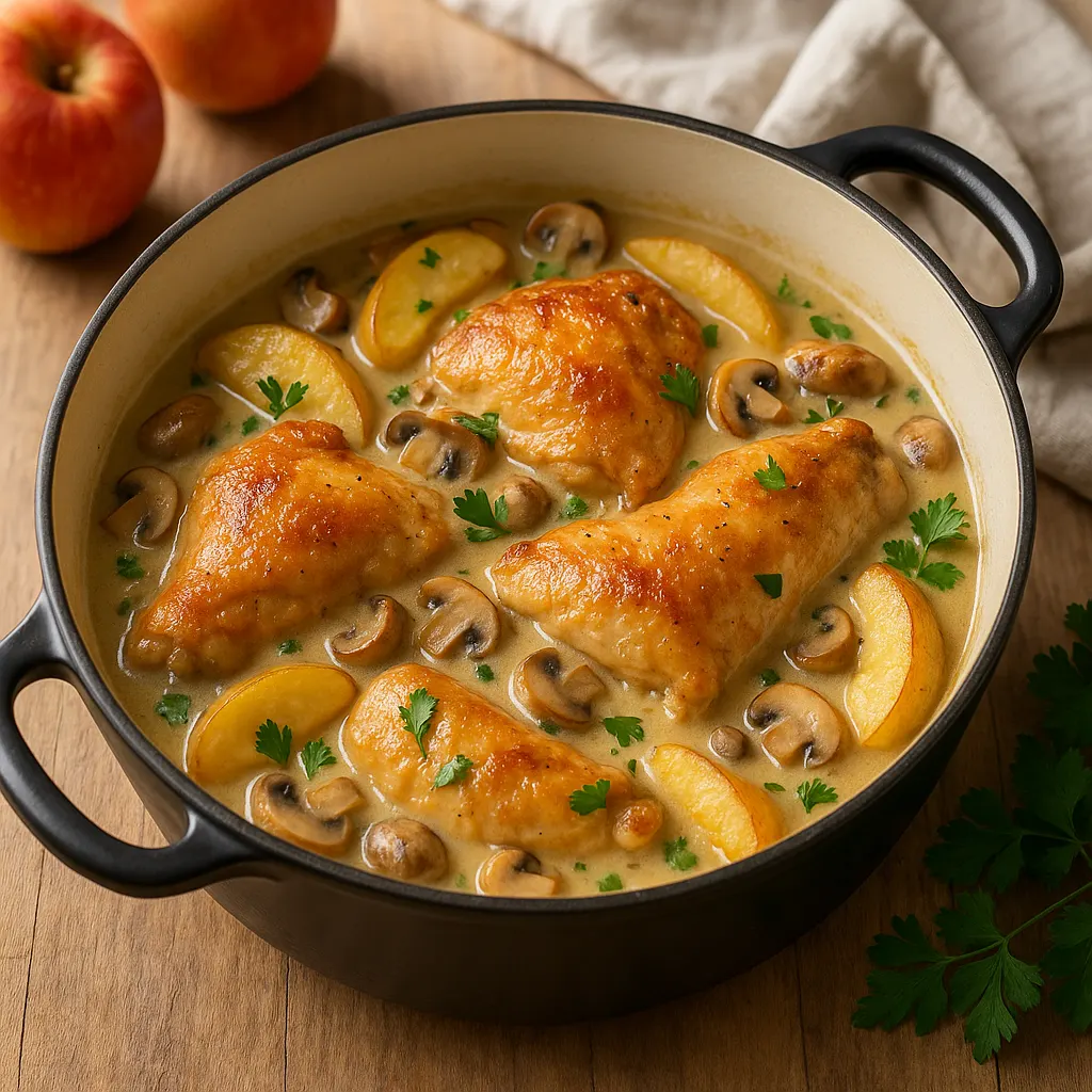 Le poulet vallée d’Auge est un plat normand de cocotte, avec une sauce au cidre adoucie par un peu de crème. Le principe est assez simple, mais quelques détails changent vraiment le goût et la tenue du plat. Le poulet doit d’abord bien colorer, le cidre doit cuire doucement, et les pommes ne doivent pas partir en compote.
