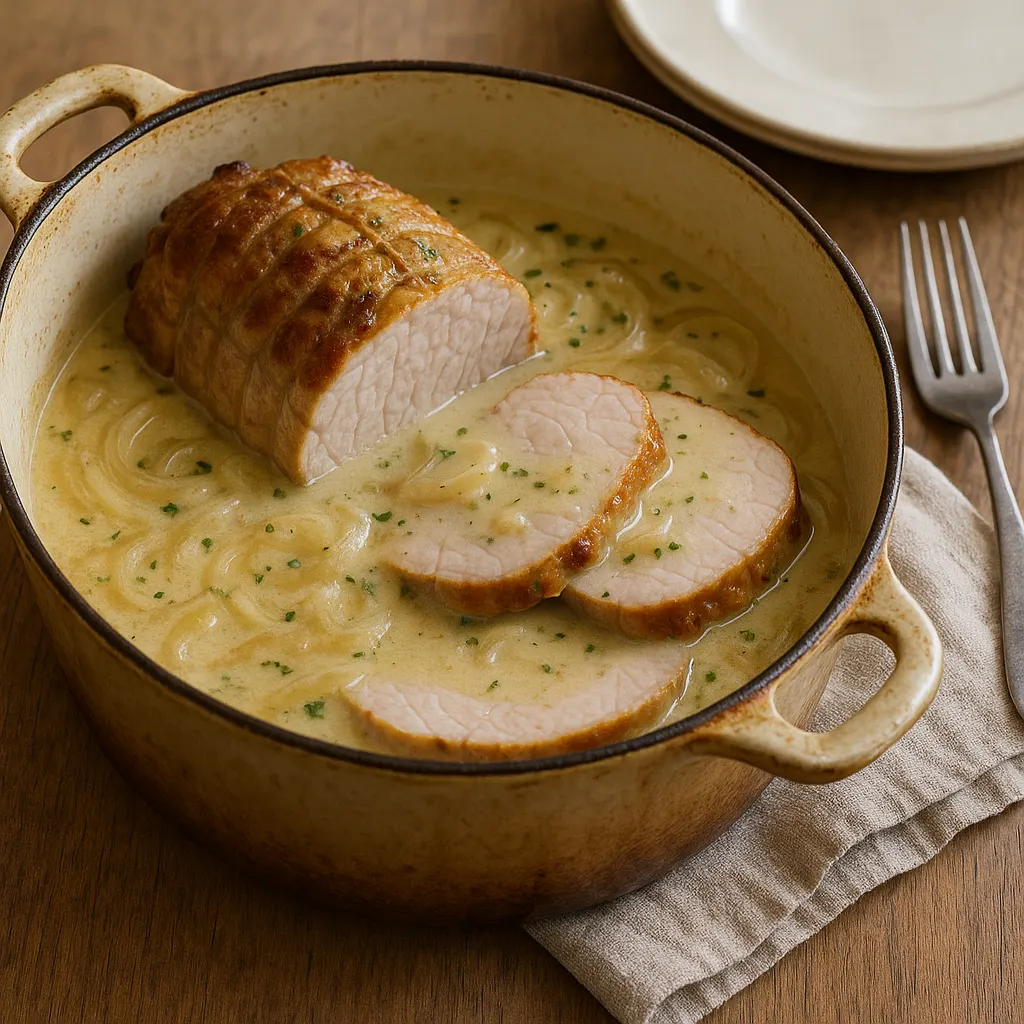 Le rôti de porc au lait fait partie des plats de cocotte qu’on refait volontiers. La préparation est courte, puis la cuisson travaille presque seule. Le lait protège la viande, les oignons fondent peu à peu, et la sauce prend une texture un peu rustique qui va très bien avec une purée, des pâtes fraîches ou des pommes de terre vapeur.