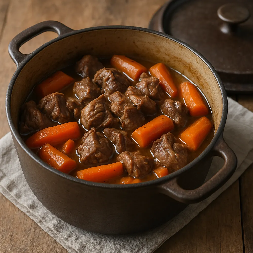 Couvrir et laisser mijoter à feu doux 1 h à 1 h 10, en remuant une ou deux fois délicatement. La viande doit devenir tendre et les carottes fondantes.