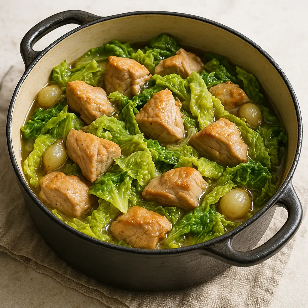 Ce sauté de dinde au chou vert a l’esprit des plats de cocotte qu’on laisse cuire doucement sans multiplier les ingrédients. Le chou est blanchi avant d’être ajouté à la viande : il s’assouplit, garde mieux sa tenue et détrempe moins la cuisson. Les oignons fondent dans le jus, le vin blanc apporte un peu de relief, et la dinde reste moelleuse si elle mijote sans bouillir fort.