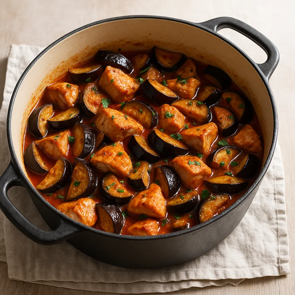 Ce sauté de dinde va droit à l’essentiel : de la tomate, de l’ail, un peu d’oignon, du thym, du laurier et des aubergines bien dorées. Le plat doit rester lié, avec peu de sauce, et des morceaux qui gardent leur forme. On n’est pas sur un ragoût longuement mijoté, mais sur une cuisson assez courte, pour garder la dinde tendre et les aubergines entières.