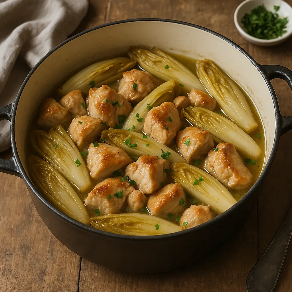 Le plat reste léger malgré la cuisson en cocotte. Les oignons adoucissent les endives sans masquer leur légère amertume. Servez-le avec des pommes de terre vapeur, une purée maison ou des pâtes fraîches si vous voulez quelque chose qui accroche bien le jus.