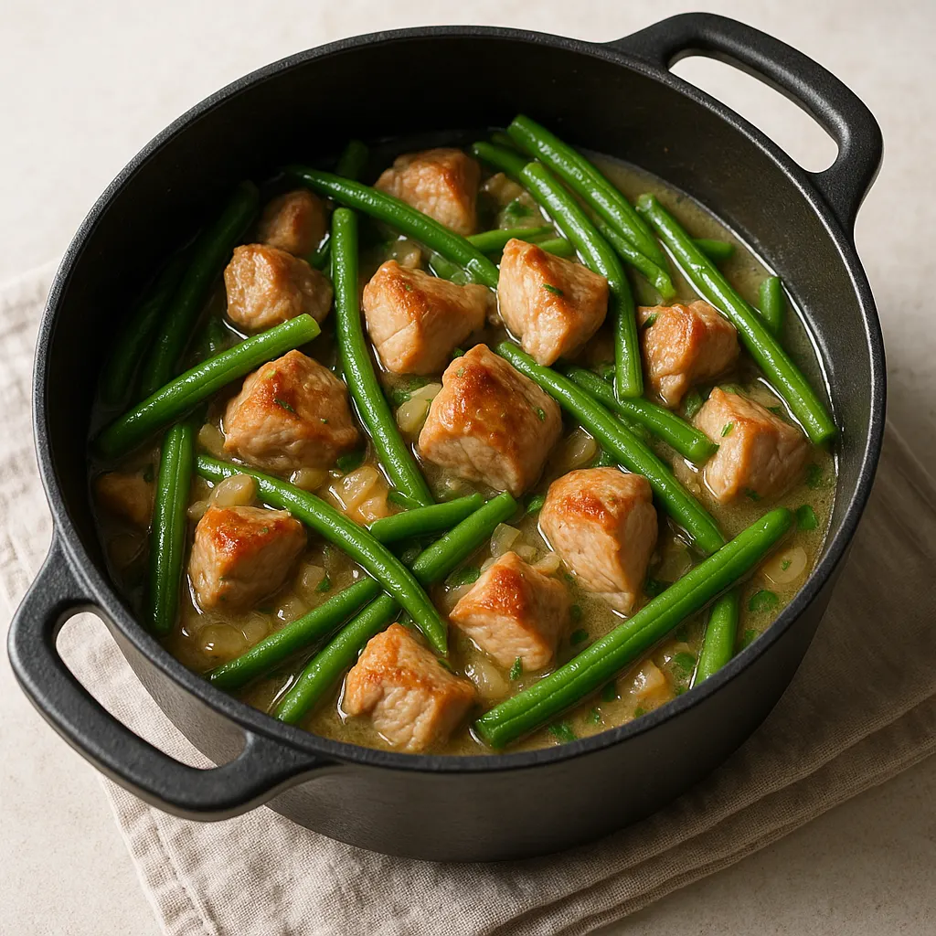 Pour les haricots verts, les deux options marchent bien. Les frais demandent un peu plus de préparation : il faut les équeuter, puis les blanchir quelques minutes avant de les ajouter dans la cocotte. Les surgelés conviennent aussi très bien, à condition de les mettre seulement en fin de cuisson.