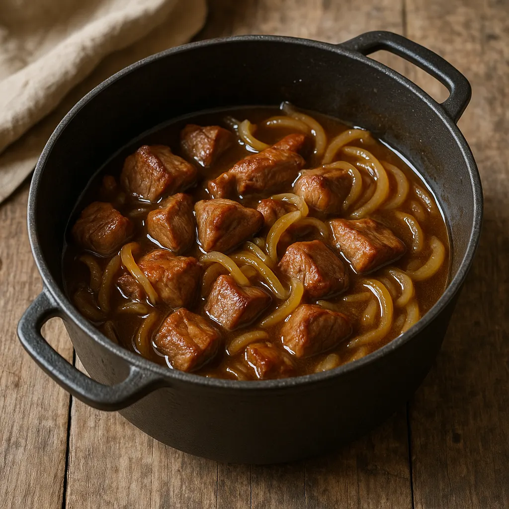Ici, la base reste volontairement courte : porc, oignons, bière, bouillon, ail et aromates. Les oignons fondent peu à peu dans la cocotte et donnent de la tenue à la sauce. Servez ce plat avec des pommes de terre vapeur, une purée pas trop liquide ou des pâtes fraîches qui garderont bien le jus.