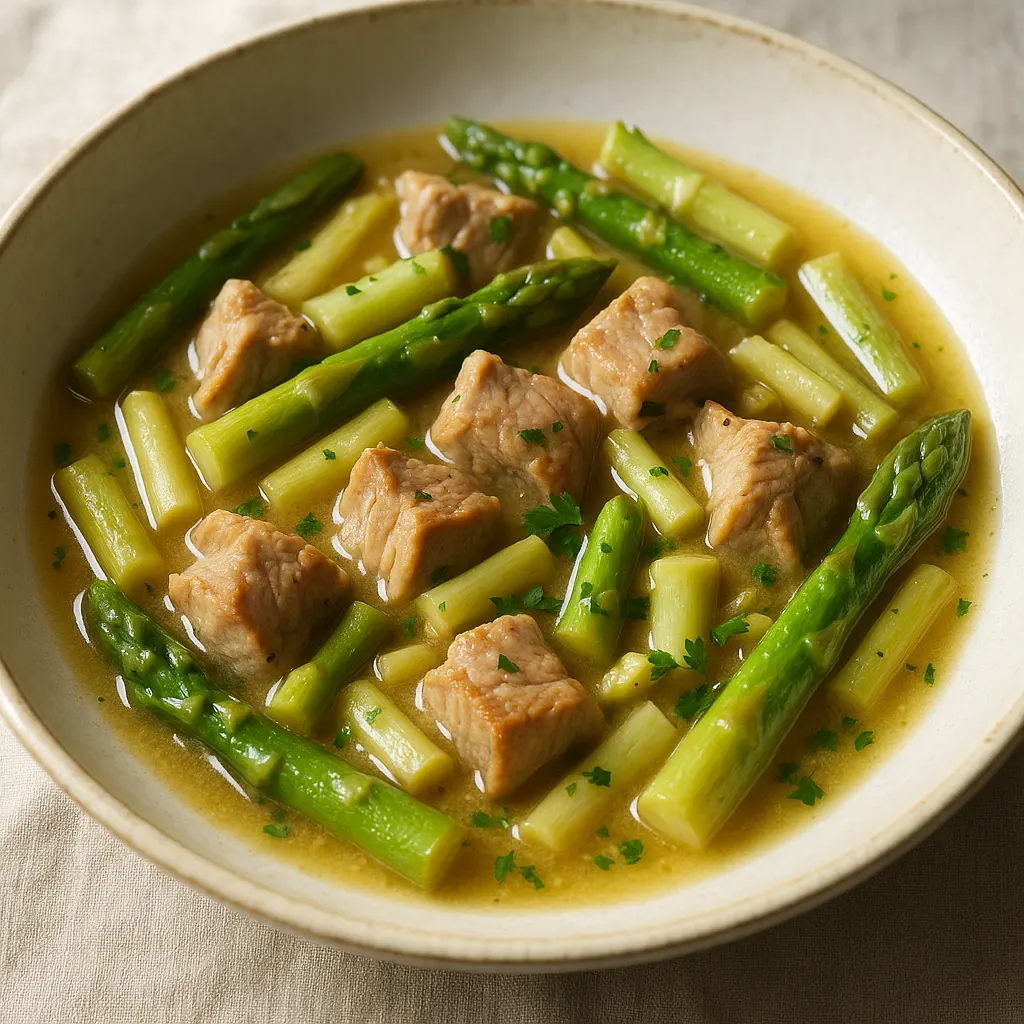 Le sauté de porc se prête bien à ce genre de cuisson douce. On commence par faire revenir la viande, puis on construit un jus léger avec des oignons, un peu de farine, du vin blanc et du bouillon. Les asperges ne viennent qu’à la fin. C’est ce qui garde le plat équilibré : la viande a le temps de s’attendrir, tandis que les légumes restent entiers et ne se délitent pas dans la cocotte.