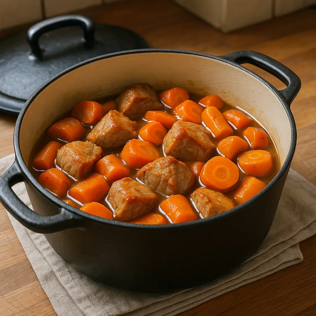 Quand la cocotte revient à frémissement, baissez le feu. Le liquide ne doit pas bouillir fort. Une cuisson trop vive resserre la viande et abîme la texture des carottes. Avec un feu doux, le porc devient tendre sans se défaire et les légumes gardent une bonne tenue.