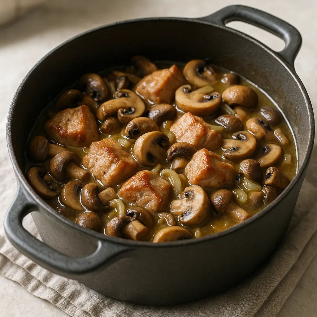 Une cuisson trop vive raffermit le porc et fait réduire trop vite. Il vaut mieux un petit frémissement régulier pendant 45 minutes, puis 10 à 15 minutes de plus avec les champignons. En fin de cuisson, adaptez selon l’aspect du jus : quelques minutes à découvert s’il est trop fluide, un trait d’eau chaude ou de bouillon s’il a trop réduit.