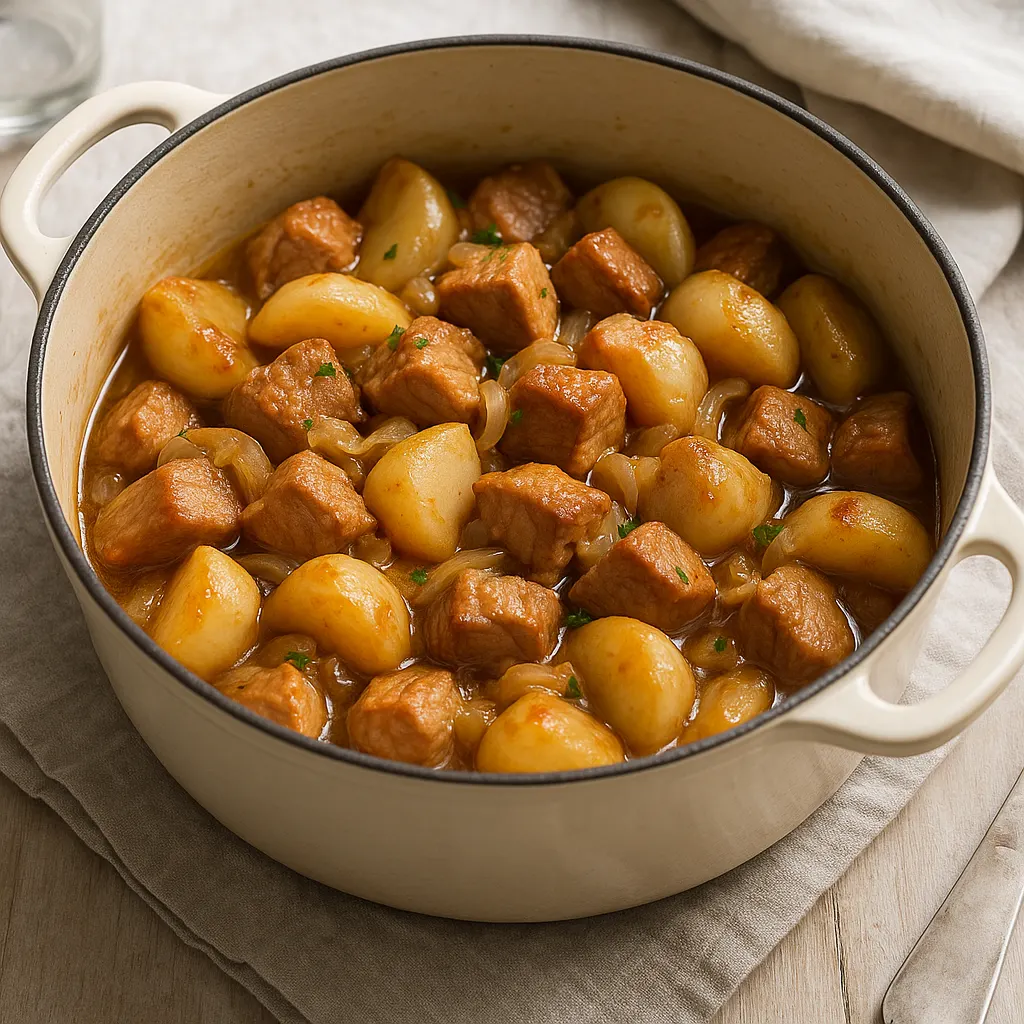 Le sauté de porc aux navets est un plat de cocotte franc et sobre. Il demande surtout un peu d’attention au départ, puis une cuisson douce. Les navets ont tout intérêt à être dorés à part avant de rejoindre la cocotte : ils gardent une bonne tenue, leur goût s’arrondit et le jus reste plus net. Avec des oignons, un peu de bouillon et une viande bien saisie, on arrive à une assiette simple, avec du relief et sans lourdeur.