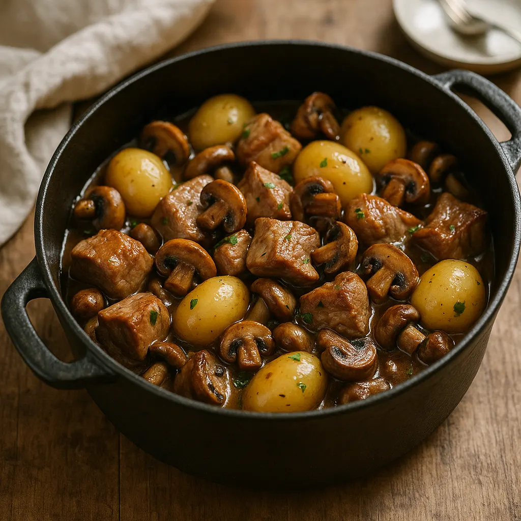 Le sauté de porc en cocotte fait partie des plats qu’on refait facilement, avec des produits simples et un peu de temps devant soi. Dans cette version, les champignons sont saisis à part pour garder leur goût, puis les pommes de terre terminent leur cuisson dans le jus. La sauce reste courte, sans crème, juste assez liée pour enrober la viande et les légumes.
