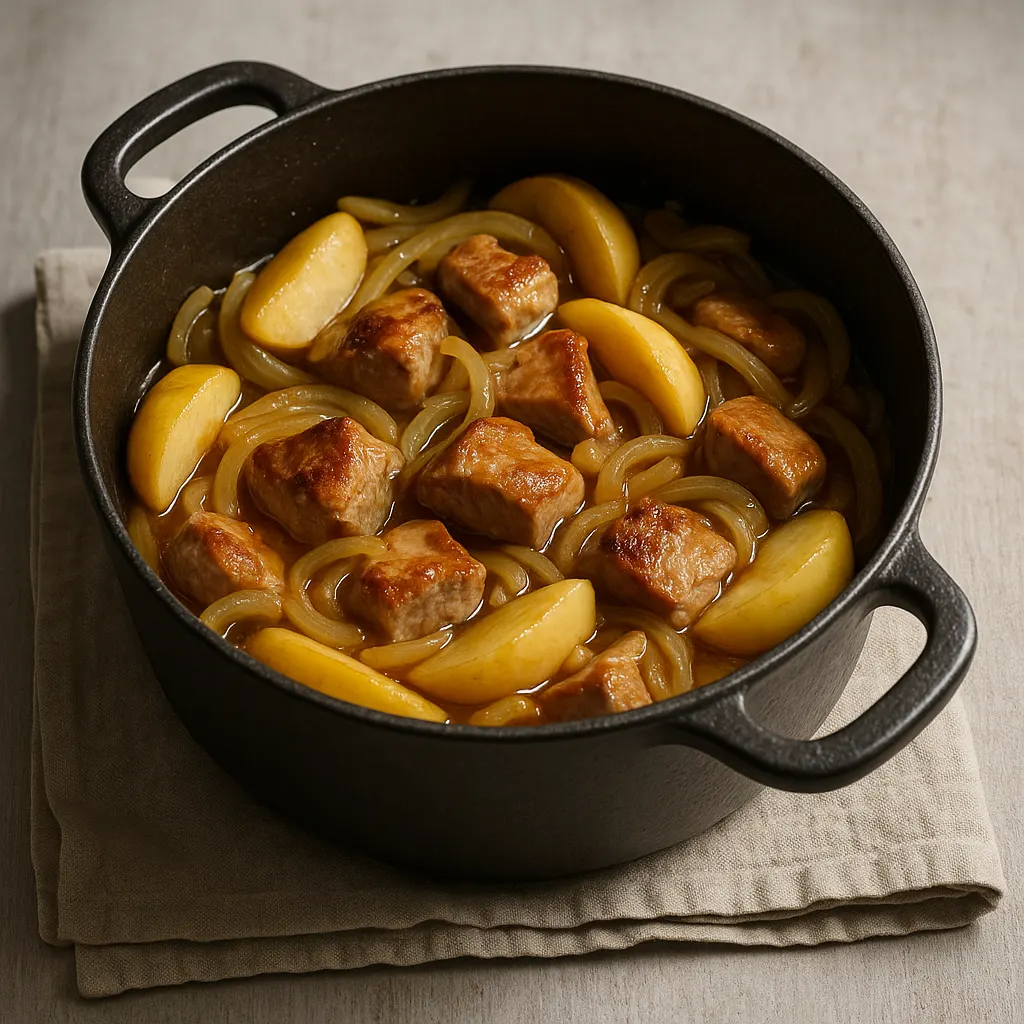 Ce sauté de porc demande peu d’ingrédients, mais un peu de soin pendant la cuisson. La viande doit d’abord bien colorer. Les oignons doivent cuire assez longtemps pour fondre sans brûler. Les pommes, elles, arrivent à la fin pour garder de la tenue. Le jus doit rester court, juste assez lié pour enrober la viande.