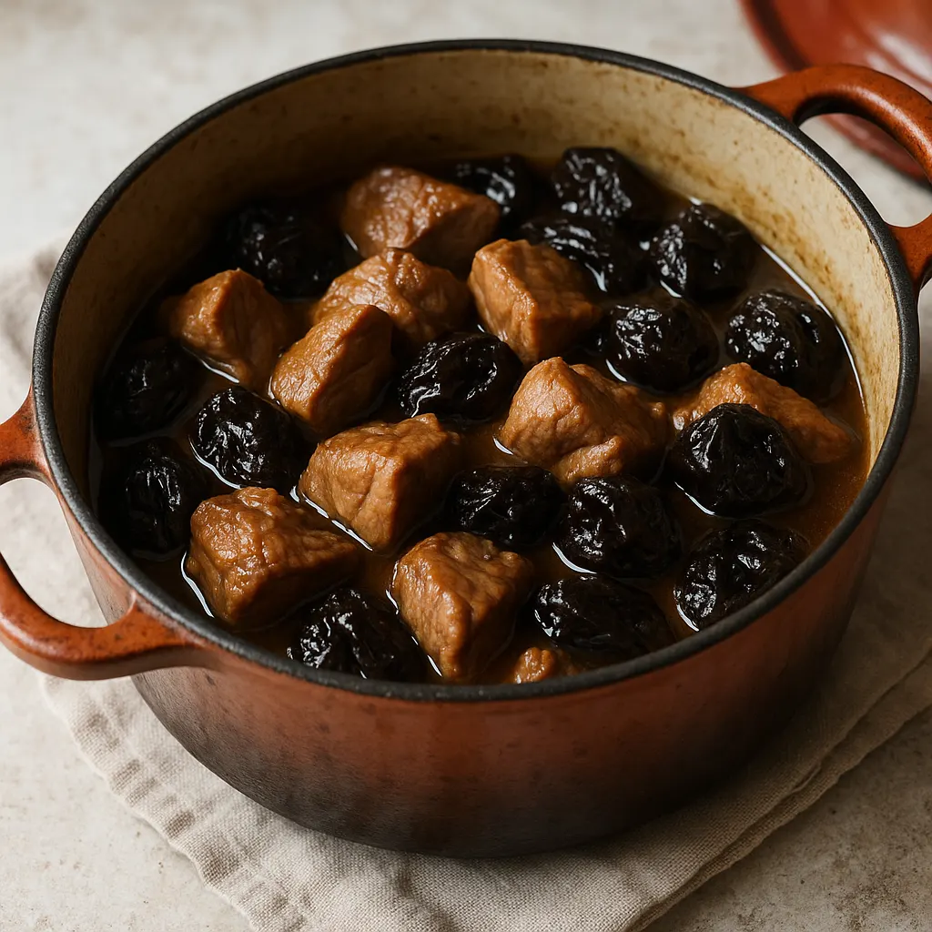 Le sauté de porc aux pruneaux est un plat de cocotte franc, avec peu d’ingrédients et une cuisson qui fait l’essentiel du travail. Les oignons fondent dans le jus, la viande s’attendrit doucement, et les pruneaux apportent une note fruitée sans prendre le dessus. Il faut surtout veiller à deux choses : bien colorer le porc au départ et garder ensuite un mijotage calme.