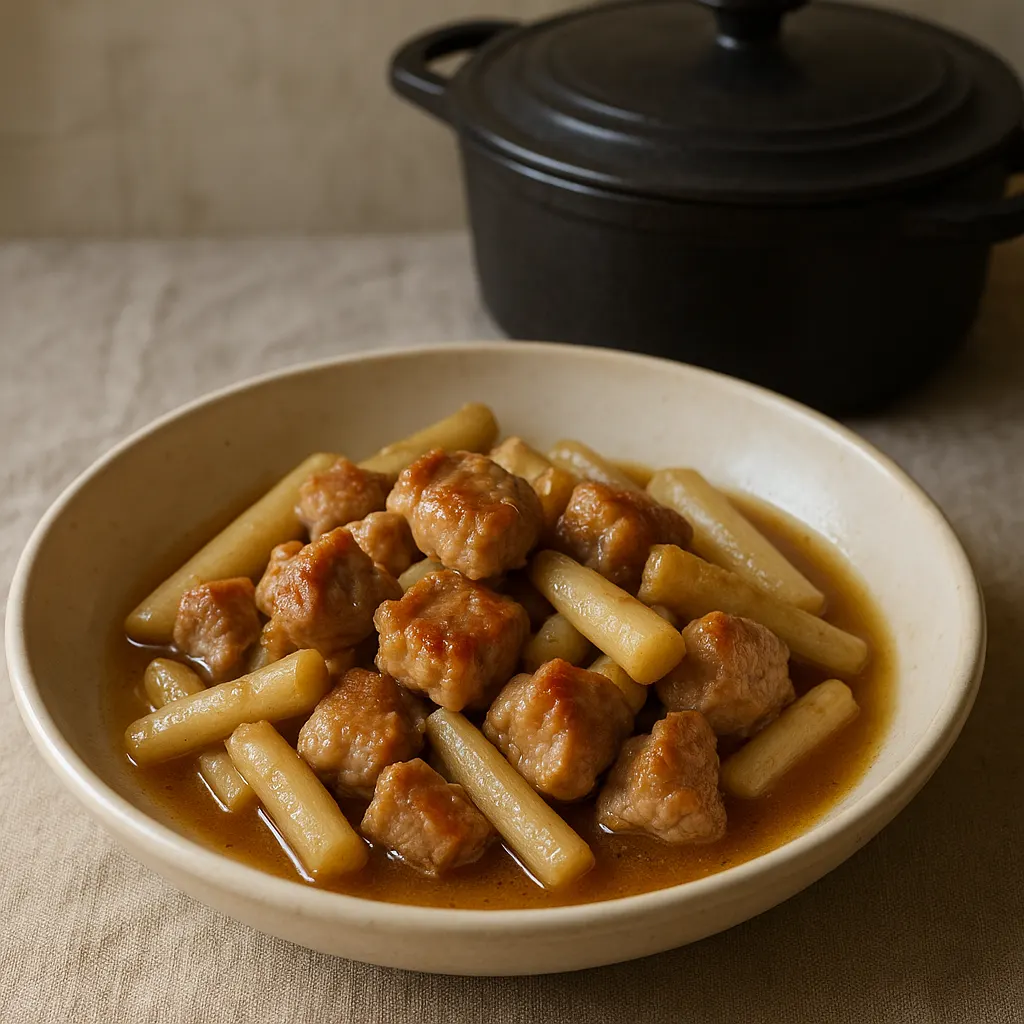 Le sauté de porc supporte bien les cuissons douces, surtout avec des légumes qui prennent le jus sans se défaire. Avec le salsifis, on reste sur quelque chose de fin : il apporte une texture tendre et un goût doux, sans alourdir la cocotte.