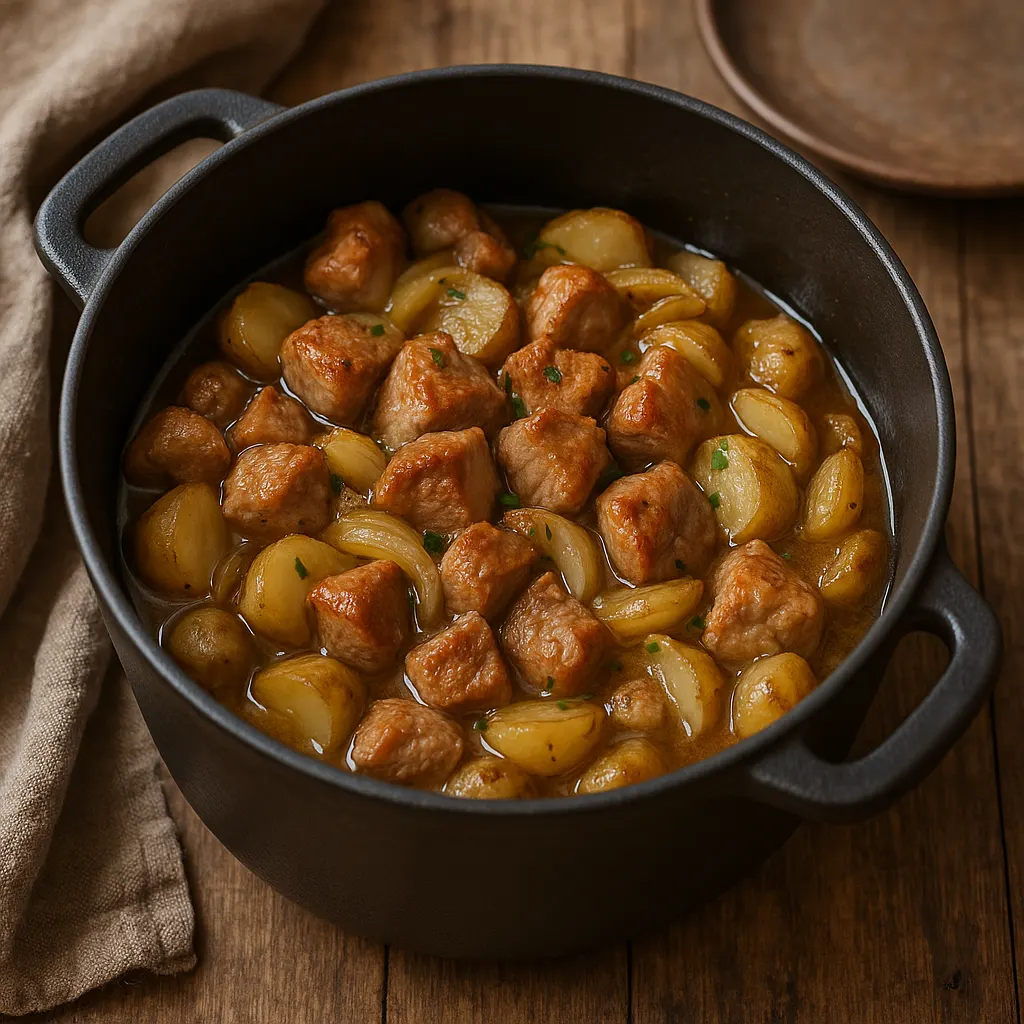 Le sauté de porc supporte bien les cuissons lentes, à condition de ne pas trop mouiller la cocotte dès le départ. Ici, l’idée est de garder un plat net : des morceaux de porc bien saisis, des oignons fondants, un peu de vin blanc sec et des topinambours cuits à part au début. Ce détail change vraiment l’ensemble. Les légumes gardent leur forme et le jus reste léger, sans tourner à la purée.