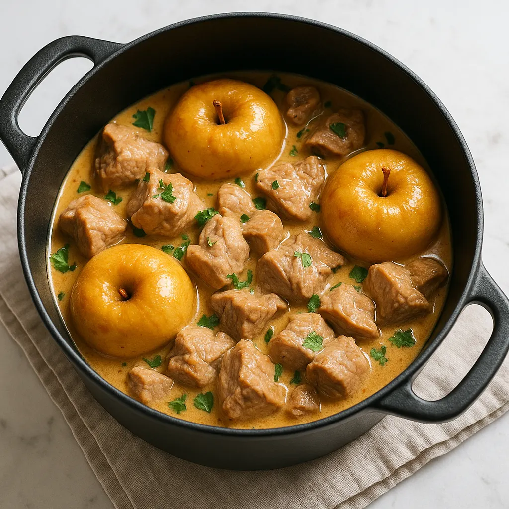 Quand vous versez le cidre puis le bouillon, grattez bien le fond de la cocotte. C’est là que se concentre une bonne partie du goût. Le liquide doit presque couvrir la viande, pas davantage. Ce plat gagne à cuire avec mesure plutôt qu’avec trop de sauce.