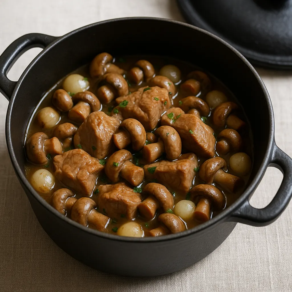 Évitez de faire bouillir franchement. La viande se raffermit vite et les champignons perdent leur texture. Si vous préparez le plat à l’avance, vous pouvez même garder les champignons un peu moins cuits la veille et finir leur passage en cocotte au moment de réchauffer.