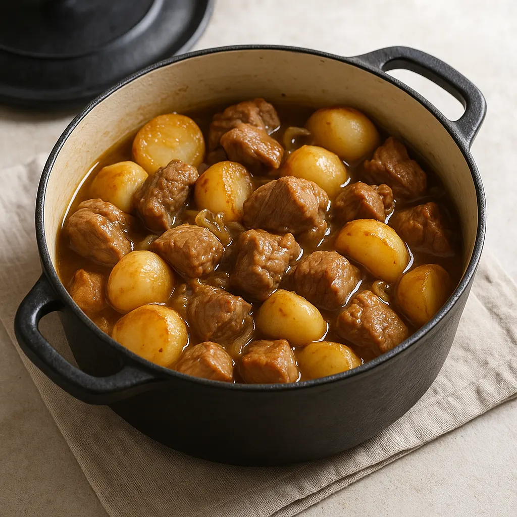 Le sauté de veau aux navets est un plat de cocotte franc et sans détour. La viande mijote doucement, les oignons forment la base du jus, et les navets, dorés à part, gardent mieux leur tenue et leur goût. On est loin d’une sauce lourde : ici, le jus reste court, blond, légèrement lié.