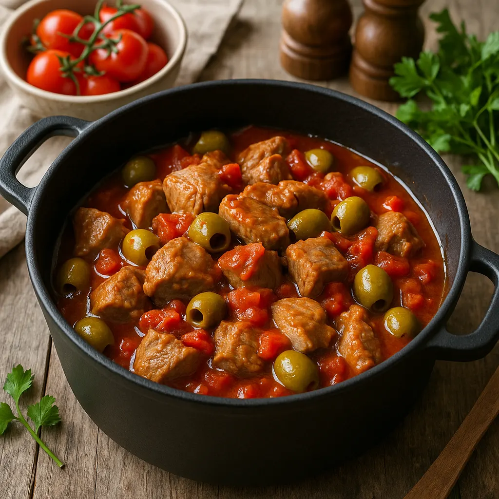 Les tomates concassées en boîte conviennent très bien ici. Elles donnent une base régulière et évitent d’avoir une sauce trop aqueuse. Pour les olives, choisissez des vertes dénoyautées, assez charnues. Si elles sont très saumurées, un rapide rinçage suffit.