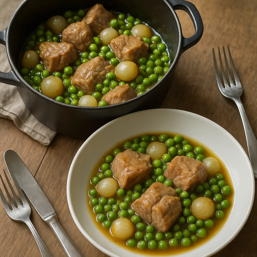 Prévoyez aussi du pain pour saucer. Le jus n’est pas abondant, mais c’est lui qui fait le lien entre la viande, les oignons et les petits pois. Côté vin, restez sur quelque chose de discret : un blanc sec ou un rouge léger suffit largement.