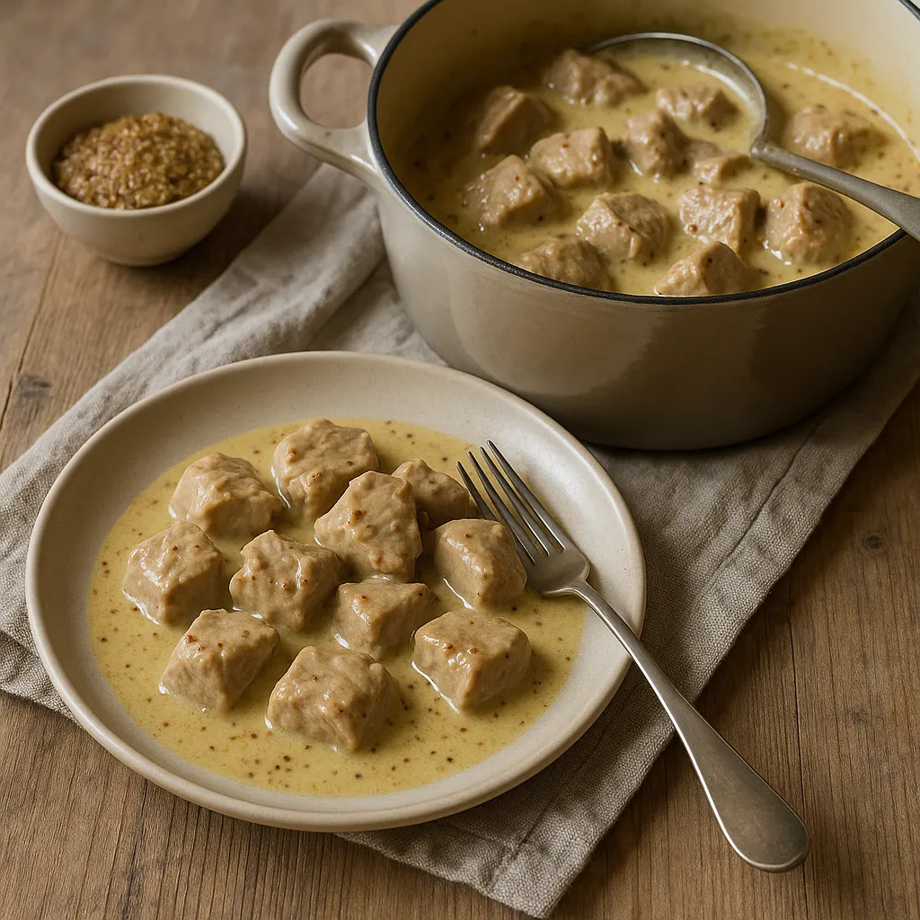 La moutarde à l’ancienne gagne à être ajoutée en deux fois. Une partie part en cuisson pour parfumer le fond de sauce. Le reste s’ajoute à la fin avec la crème, ce qui garde mieux son grain et son goût. C’est un détail simple, mais il change l’équilibre du plat.